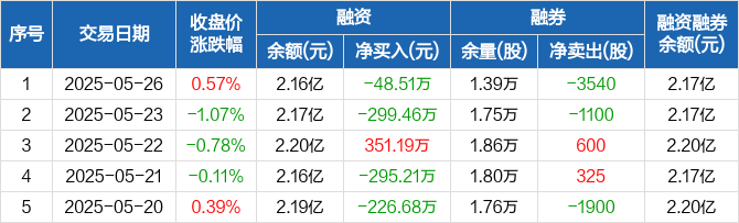 融资方面,当日融资买入163.85万元,融资偿还212.37万元,融资净偿还48.51万元。融券方面,融券卖出1100股,融券偿还4640股,融券余量1.39万股,融券余额38.96万元。融资融券余额合计2.17亿元。