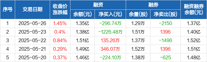融资方面,当日融资买入925.62万元,融资偿还1222.36万元,融资净偿还296.74万元。融券方面,融券卖出900股,融券偿还3050股,融券余量1.29万股,融券余额181.78万元。融资融券余额合计1.37亿元。