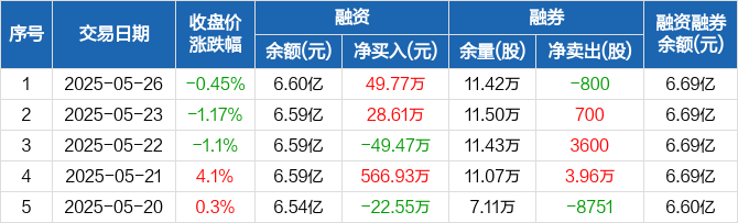 融资方面,当日融资买入2198.19万元,融资偿还2148.43万元,融资净买入49.77万元。融券方面,融券卖出900股,融券偿还1700股,融券余量11.42万股,融券余额980.56万元。融资融券余额合计6.69亿元。