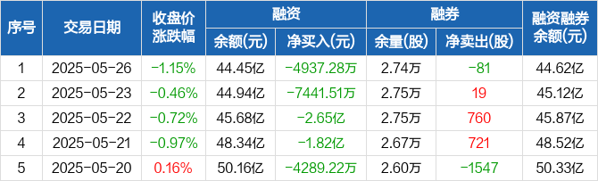 融资方面,当日融资买入1.01亿元,融资偿还1.51亿元,融资净偿还4937.28万元,净偿还额两市排名第12,连续8日净偿还累计11.64亿元。融券方面,融券卖出719股,融券偿还800股,融券余量2.74万股,融券余额1786.21万元。融资融券余额合计44.62亿元。