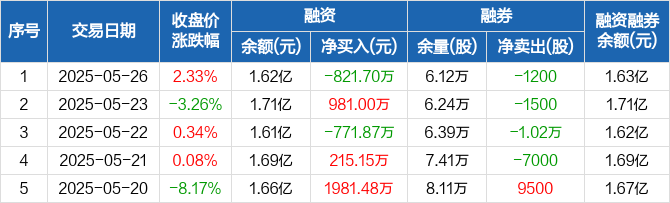 融资方面,当日融资买入1644.85万元,融资偿还2466.55万元,融资净偿还821.7万元。融券方面,融券卖出3200股,融券偿还4400股,融券余量6.12万股,融券余额72.52万元。融资融券余额合计1.63亿元。