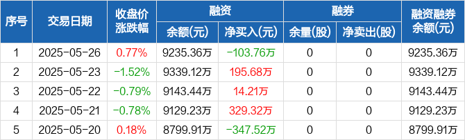 融资方面,当日融资买入164.26万元,融资偿还268.02万元,融资净偿还103.76万元。融券方面,融券卖出0股,融券偿还0股,融券余量0股,融券余额0元。融资融券余额合计9235.36万元。