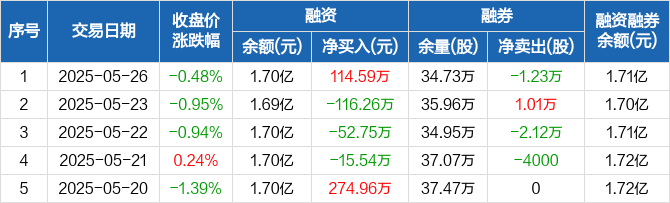 融资方面,当日融资买入237.35万元,融资偿还122.76万元,融资净买入114.59万元。融券方面,融券卖出0股,融券偿还1.23万股,融券余量34.73万股,融券余额144.48万元。融资融券余额合计1.71亿元。