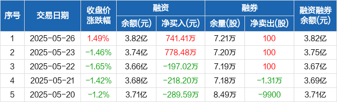融资方面,当日融资买入1251.55万元,融资偿还510.13万元,融资净买入741.41万元。融券方面,融券卖出100股,融券偿还0股,融券余量7.21万股,融券余额34.46万元。融资融券余额合计3.82亿元。