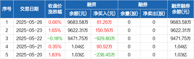 融资方面,当日融资买入973.75万元,融资偿还912.49万元,融资净买入61.26万元。融券方面,融券卖出0股,融券偿还0股,融券余量0股,融券余额0元。融资融券余额合计9683.58万元。