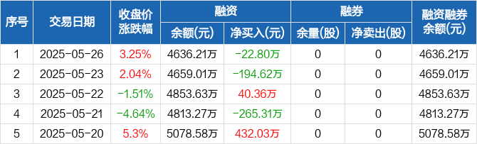 融资方面,当日融资买入67.82万元,融资偿还90.62万元,融资净偿还22.8万元。融券方面,融券卖出0股,融券偿还0股,融券余量0股,融券余额0元。融资融券余额合计4636.21万元。
