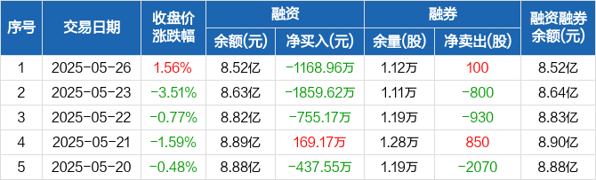融资方面,当日融资买入1444.85万元,融资偿还2613.81万元,融资净偿还1168.96万元,连续3日净偿还累计3783.75万元。融券方面,融券卖出600股,融券偿还500股,融券余量1.12万股,融券余额55.17万元。融资融券余额合计8.52亿元。