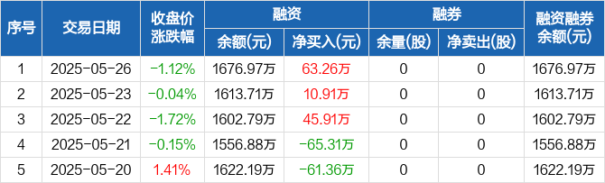 融资方面,当日融资买入123.63万元,融资偿还60.37万元,融资净买入63.26万元,连续3日净买入累计120.09万元。融券方面,融券卖出0股,融券偿还0股,融券余量0股,融券余额0元。融资融券余额合计1676.97万元。