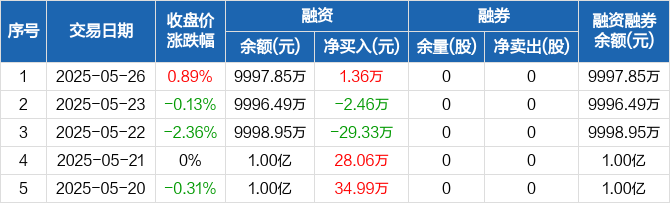 融资方面,当日融资买入186.88万元,融资偿还185.52万元,融资净买入1.36万元。融券方面,融券卖出0股,融券偿还0股,融券余量0股,融券余额0元。融资融券余额合计9997.85万元。