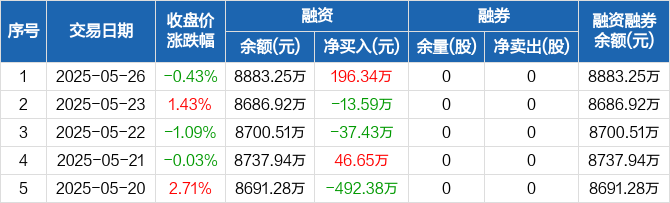 融资方面,当日融资买入363.27万元,融资偿还166.94万元,融资净买入196.34万元。融券方面,融券卖出0股,融券偿还0股,融券余量0股,融券余额0元。融资融券余额合计8883.25万元。