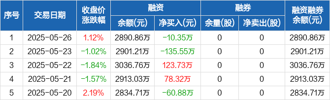 融资方面,当日融资买入226.96万元,融资偿还237.31万元,融资净偿还10.35万元。融券方面,融券卖出0股,融券偿还0股,融券余量0股,融券余额0元。融资融券余额合计2890.86万元。