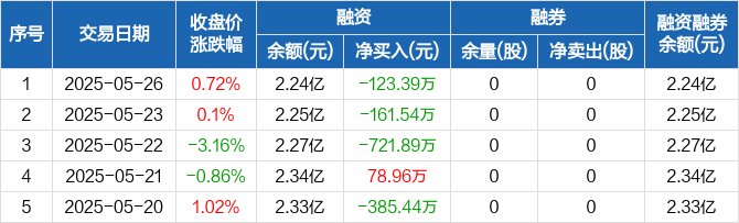 融资方面,当日融资买入451.48万元,融资偿还574.87万元,融资净偿还123.39万元,连续3日净偿还累计1006.82万元。融券方面,融券卖出0股,融券偿还0股,融券余量0股,融券余额0元。融资融券余额合计2.24亿元。