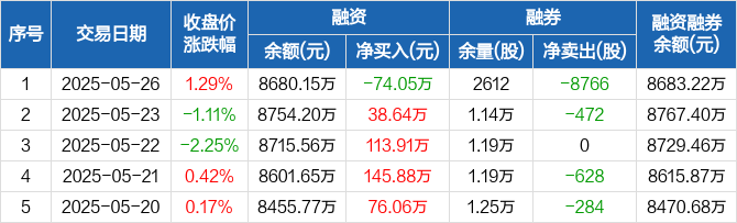 融资方面,当日融资买入499.16万元,融资偿还573.21万元,融资净偿还74.05万元。融券方面,融券卖出0股,融券偿还8766股,融券余量2612股,融券余额3.07万元。融资融券余额合计8683.22万元。