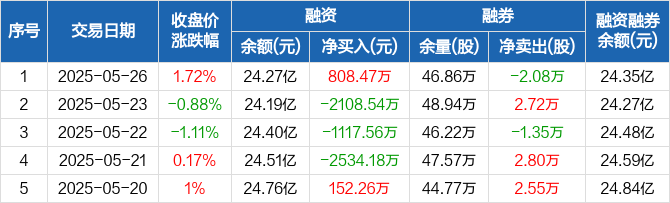 融资方面,当日融资买入4652.91万元,融资偿还3844.44万元,融资净买入808.47万元。融券方面,融券卖出4.96万股,融券偿还7.04万股,融券余量46.86万股,融券余额802.71万元。融资融券余额合计24.35亿元。