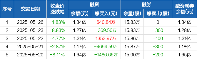 融资方面,当日融资买入2870.52万元,融资偿还2229.68万元,融资净买入640.84万元。融券方面,融券卖出0股,融券偿还0股,融券余量15.83万股,融券余额59.36万元。融资融券余额合计1.34亿元。