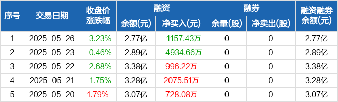 融资方面,当日融资买入1108.48万元,融资偿还2265.91万元,融资净偿还1157.43万元。融券方面,融券卖出0股,融券偿还0股,融券余量0股,融券余额0元。融资融券余额合计2.77亿元。