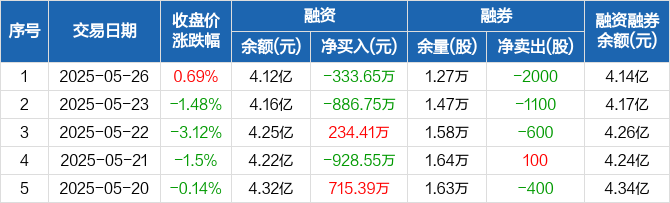 融资方面,当日融资买入1845.29万元,融资偿还2178.94万元,融资净偿还333.65万元。融券方面,融券卖出100股,融券偿还2100股,融券余量1.27万股,融券余额142.02万元。融资融券余额合计4.14亿元。