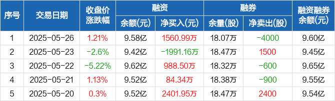融资方面,当日融资买入6175.43万元,融资偿还4614.43万元,融资净买入1560.99万元。融券方面,融券卖出2700股,融券偿还6700股,融券余量18.07万股,融券余额226.24万元。融资融券余额合计9.6亿元。