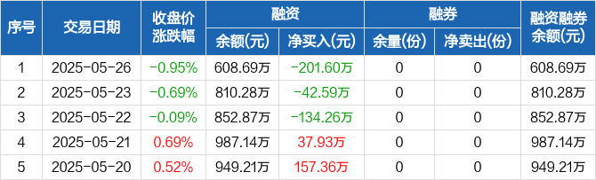 融资方面,当日融资买入54.03万元,融资偿还255.62万元,融资净偿还201.6万元,连续3日净偿还累计378.45万元。融券方面,融券卖出0份,融券偿还0份,融券余量0份,融券余额0元。融资融券余额合计608.69万元。