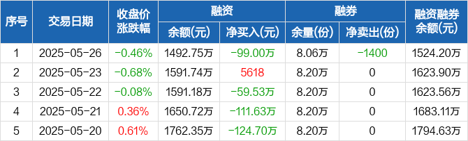沪深300ETF南方融资融券信息显示,2025年5月26日融资净偿还99万元;融资余额1492.75万元,较前一日下降6.22%。