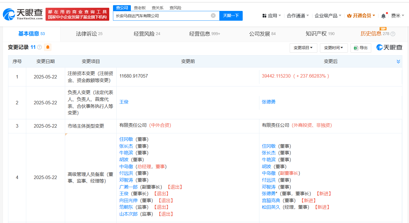 南方财经5月27日电,天眼查App显示,近日,长安马自达汽车有限公司发生工商变更,注册资本由约1.17亿美元增至约3.94亿美元,增幅约238%,王俊卸任法定代表人、董事长,由张德勇接任,同时多位高管发生变更。该公司成立于2012年11月,经营范围包括道路机动车辆生产、汽车销售、汽车零部件及配件制造等,由重庆长安汽车股份有限公司、马自达汽车株式会社、中国第一汽车股份有限公司、马自达(中国)企业管理有限公司共同持股。