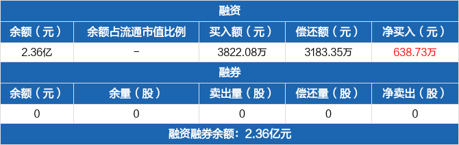 融资方面,当日融资买入3822.08万元,融资偿还3183.35万元,融资净买入638.73万元,连续3日净买入累计1592.73万元。融券方面,融券卖出0份,融券偿还0份,融券余量0份,融券余额0元。融资融券余额合计2.36亿元。