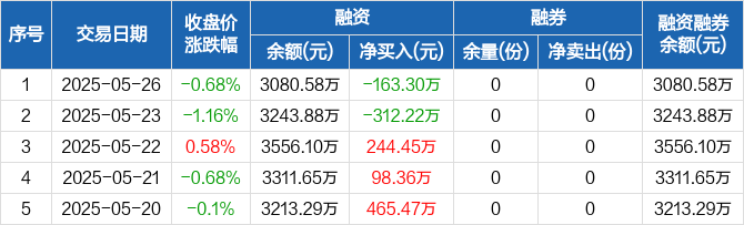 融资方面,当日融资买入3748.29万元,融资偿还3911.59万元,融资净偿还163.3万元。融券方面,融券卖出0份,融券偿还0份,融券余量0份,融券余额0元。融资融券余额合计3080.58万元。