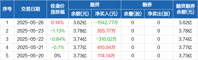 融资方面,当日融资买入1649.38万元,融资偿还3192.15万元,融资净偿还1542.77万元。融券方面,融券卖出0股,融券偿还0股,融券余量0股,融券余额0元。融资融券余额合计3.62亿元。