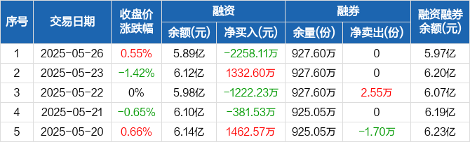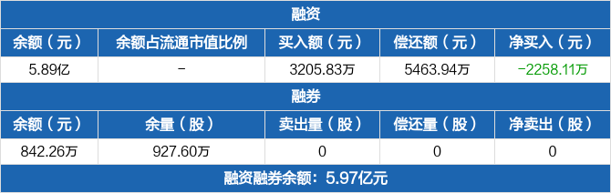 融资方面,当日融资买入3205.83万元,融资偿还5463.94万元,融资净偿还2258.11万元。融券方面,融券卖出0份,融券偿还0份,融券余量927.6万份,融券余额842.26万元。融资融券余额合计5.97亿元。