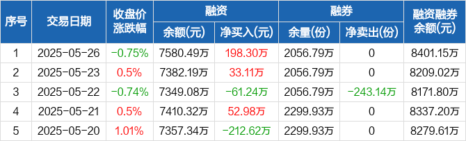 融资方面,当日融资买入423.15万元,融资偿还224.85万元,融资净买入198.3万元。融券方面,融券卖出0份,融券偿还0份,融券余量2056.79万份,融券余额820.66万元。融资融券余额合计8401.15万元。