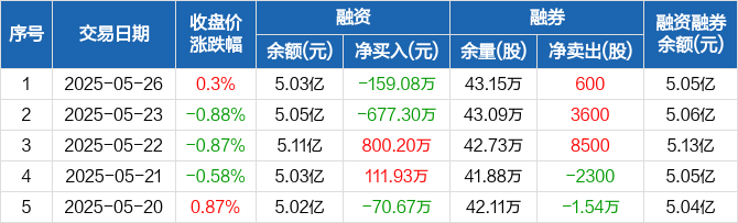 融资方面,当日融资买入851.66万元,融资偿还1010.74万元,融资净偿还159.08万元。融券方面,融券卖出3800股,融券偿还3200股,融券余量43.15万股,融券余额146.71万元。融资融券余额合计5.05亿元。