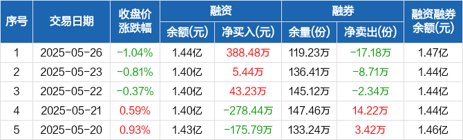 融资方面,当日融资买入535.68万元,融资偿还147.19万元,融资净买入388.48万元,连续3日净买入累计437.15万元。融券方面,融券卖出2000份,融券偿还17.38万份,融券余量119.23万份,融券余额317.27万元。融资融券余额合计1.47亿元。