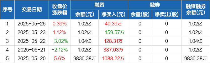 融资方面,当日融资买入931.82万元,融资偿还891.43万元,融资净买入40.39万元。融券方面,融券卖出0股,融券偿还0股,融券余量0股,融券余额0元。融资融券余额合计1.02亿元。
