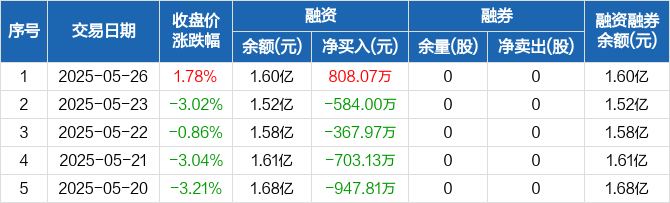 融资方面,当日融资买入2264.97万元,融资偿还1456.91万元,融资净买入808.07万元。融券方面,融券卖出0股,融券偿还0股,融券余量0股,融券余额0元。融资融券余额合计1.6亿元。