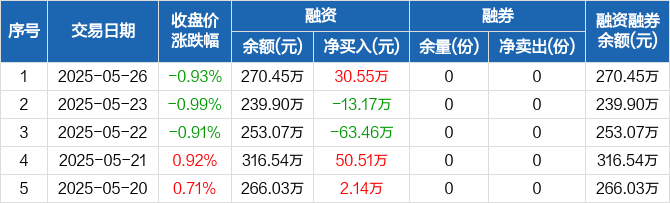 融资方面,当日融资买入48.15万元,融资偿还17.6万元,融资净买入30.55万元。融券方面,融券卖出0份,融券偿还0份,融券余量0份,融券余额0元。融资融券余额合计270.45万元。