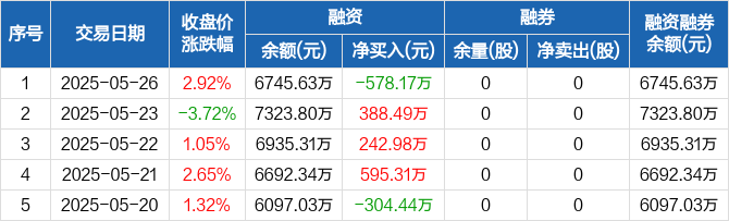融资方面,当日融资买入1577.63万元,融资偿还2155.8万元,融资净偿还578.17万元。融券方面,融券卖出0股,融券偿还0股,融券余量0股,融券余额0元。融资融券余额合计6745.63万元。