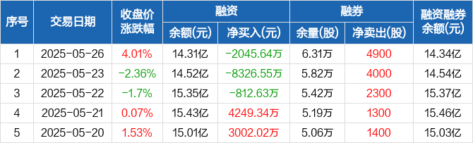 融资方面,当日融资买入8481.18万元,融资偿还1.05亿元,融资净偿还2045.64万元,连续3日净偿还累计1.12亿元。融券方面,融券卖出1万股,融券偿还5100股,融券余量6.31万股,融券余额285.09万元。融资融券余额合计14.34亿元。