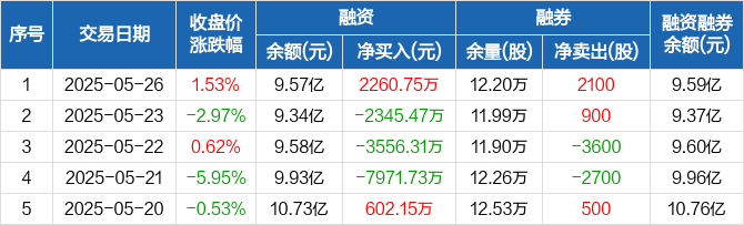 融资方面,当日融资买入7830.31万元,融资偿还5569.56万元,融资净买入2260.75万元。融券方面,融券卖出3200股,融券偿还1100股,融券余量12.2万股,融券余额235.09万元。融资融券余额合计9.59亿元。
