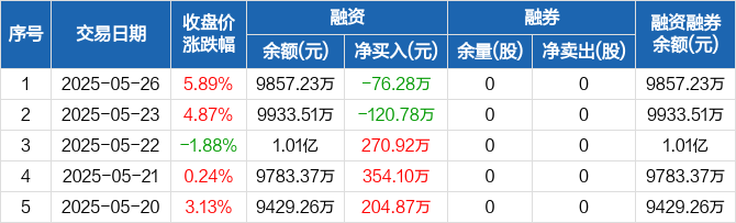 融资方面,当日融资买入1188.88万元,融资偿还1265.15万元,融资净偿还76.28万元。融券方面,融券卖出0股,融券偿还0股,融券余量0股,融券余额0元。融资融券余额合计9857.23万元。
