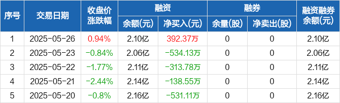 融资方面,当日融资买入848.85万元,融资偿还456.48万元,融资净买入392.37万元。融券方面,融券卖出0股,融券偿还0股,融券余量0股,融券余额0元。融资融券余额合计2.1亿元。