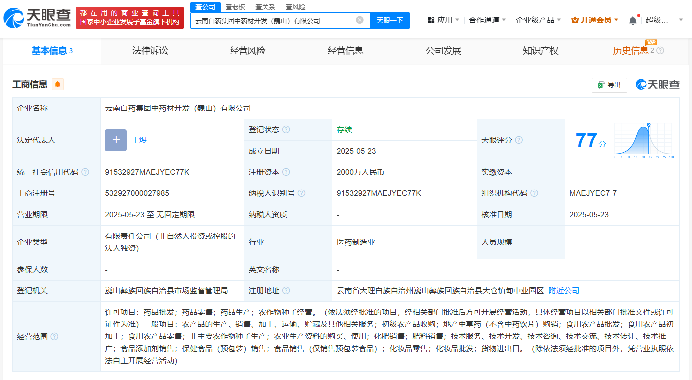 南方财经5月27日电,天眼查App显示,近日,云南白药集团中药材开发(巍山)有限公司成立,法定代表人为王煜,注册资本2000万人民币,经营范围包括药品批发、药品零售、药品生产、农作物种子经营等。股东信息显示,该公司由云南白药集团中药资源有限公司全资持股。