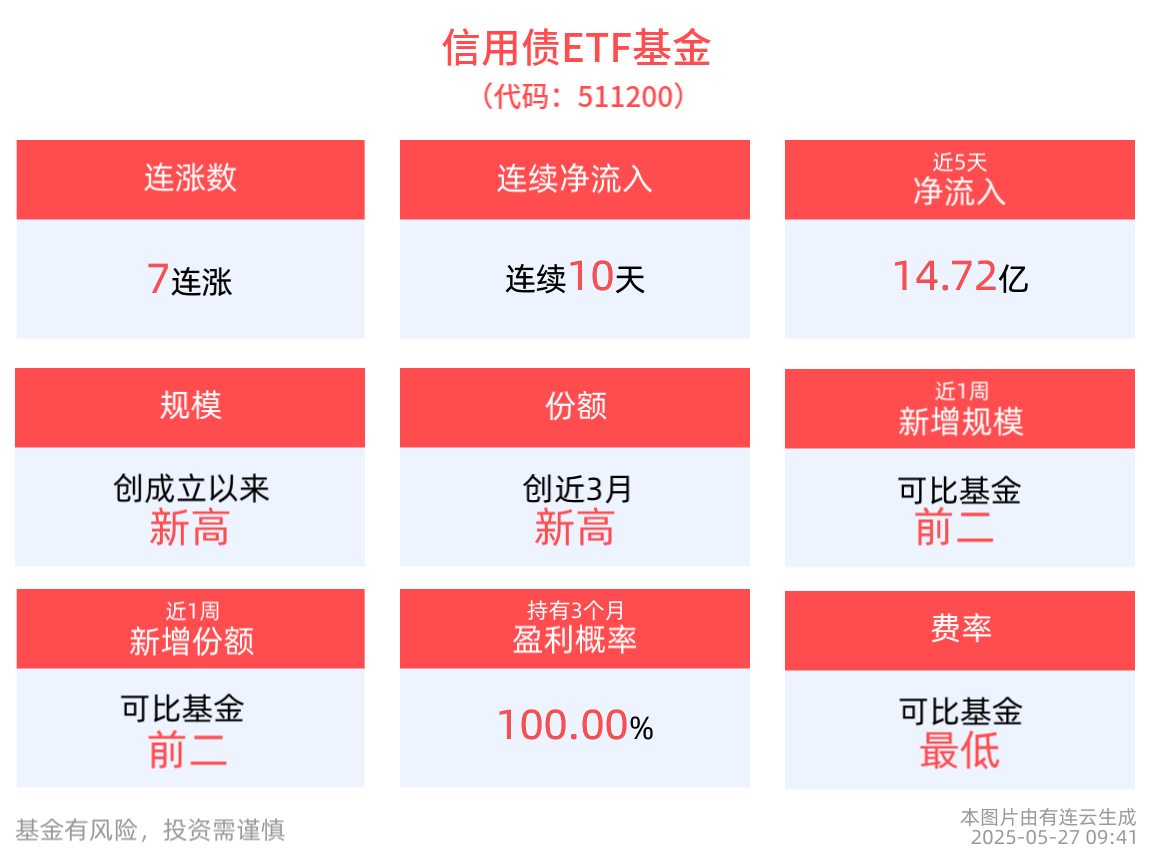 截至2025年5月27日9:40,信用债ETF基金(511200)上涨0.04%, 冲击7连涨。最新价报100.73元。
