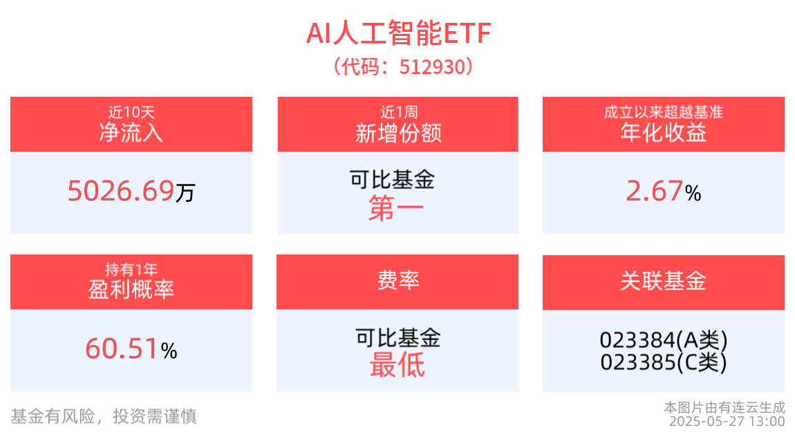 份额方面,AI人工智能ETF近1周份额增长500.00万份,实现显著增长,新增份额位居可比基金1/3。
