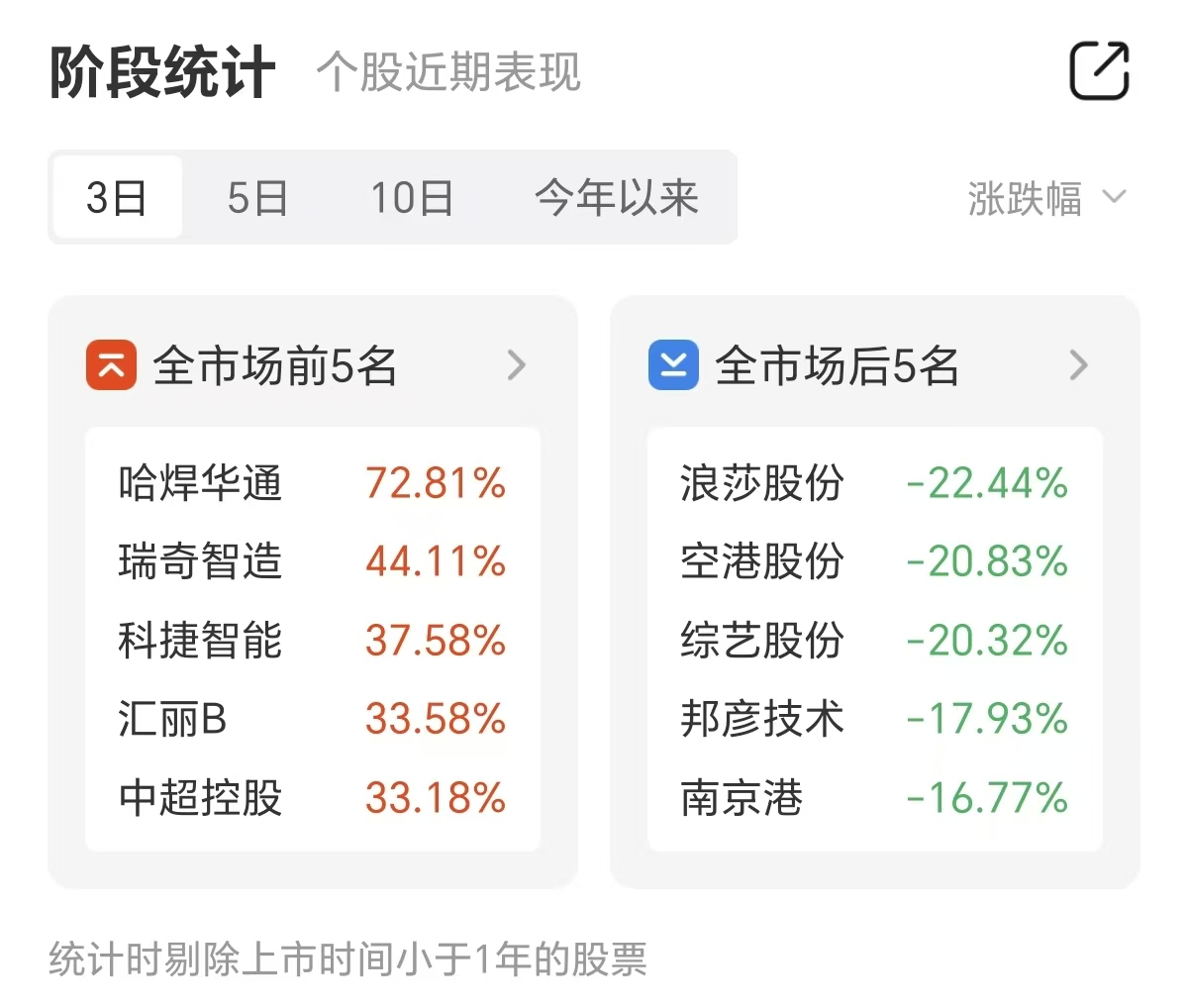 5月27日市场震荡调整,A股全市场涨幅前五名分别为哈焊华通、瑞奇智造、科捷智能、汇丽B、中超控股,其中哈焊华通三日涨幅达72.81%,位列涨幅榜第一。