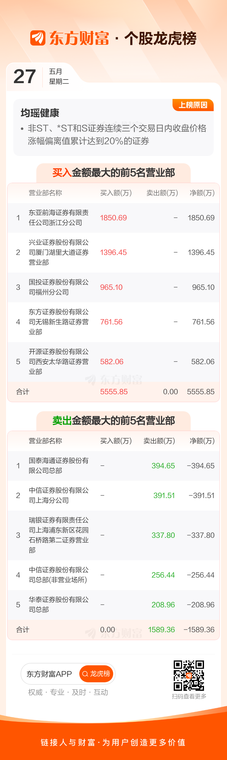 交易所2025年5月27日公布的交易公开信息显示,均瑶健康因成为非ST、*ST和S证券连续三个交易日内收盘价格涨幅偏离值累计达到20%的证券上榜。均瑶健康当日收报7.69元,涨跌幅10.01%,换手率0.89%,成交额4129.31万。异常期间5月26日至5月27日,期间涨幅21.10%,累计偏离值21.33%,区间成交额1.30亿。