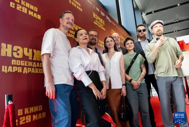 5月25日,在俄罗斯首都莫斯科,《哪吒之魔童闹海》俄文配音版译制团队成员在影片首映活动上合影。新华社记者孟菁摄