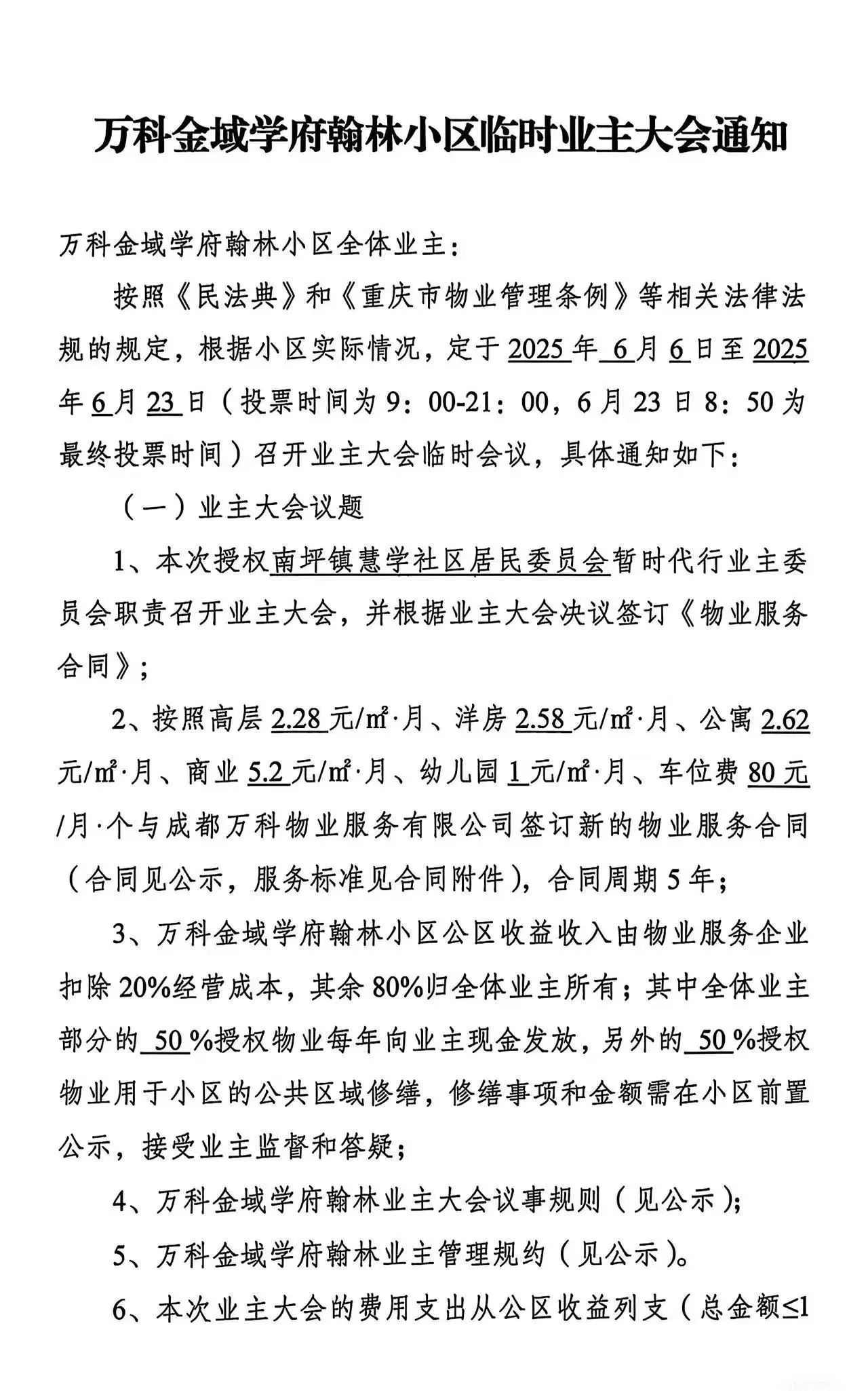 5月27日,《每日经济新闻》记者从知情人士处获悉,日前,重庆南岸区南坪镇人民政府发布了《万科金域学府翰林小区临时业主大会通知》。根据通知,万科金域学府翰林将于近期召开业主大会,重新签订物业服务合同,并引入“弹性定价”模式,将物业服务选择和定价权交给业主。
