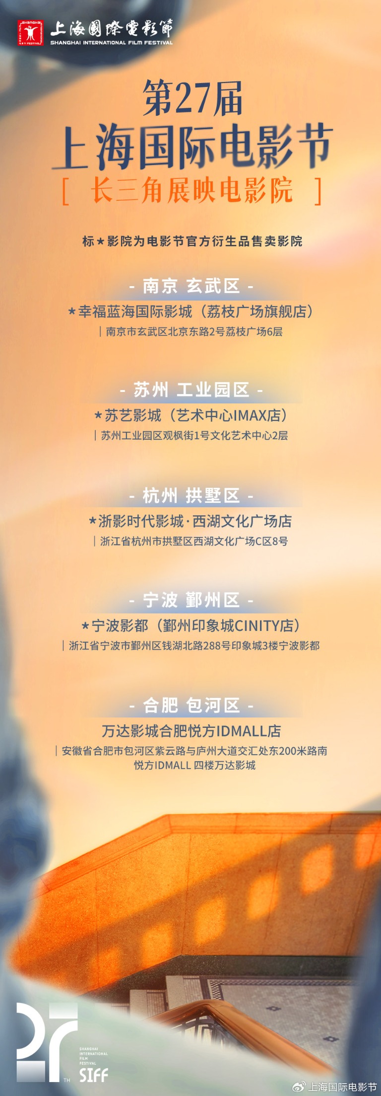 长三角地区影迷依然可在家门口共赴光影盛宴。长三角放映期间,来自共建“一带一路”国家及其他海内外电影人的最新佳作,将于6月20日至6月27日期间在南京、苏州、杭州、宁波、合肥5个城市5家影院的5个影厅集中放映。