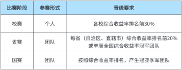 校赛阶段,学生以个人名义参赛,各校综合收益率排名前30%的学生晋级进入省赛。省赛阶段,学生以团队形式组队参赛,由晋级省赛的学生担任操盘手,邀请同校学生作为策略师、风控师组建团队,每省(自治区、直辖市)综合收益率排名前20%的团队进入国赛;单周全国综合收益率冠军团队可直接晋级进入国赛。国赛阶段,晋级学生延续省赛团队继续比拼,按照综合收益率排名,产生冠亚季军团队。