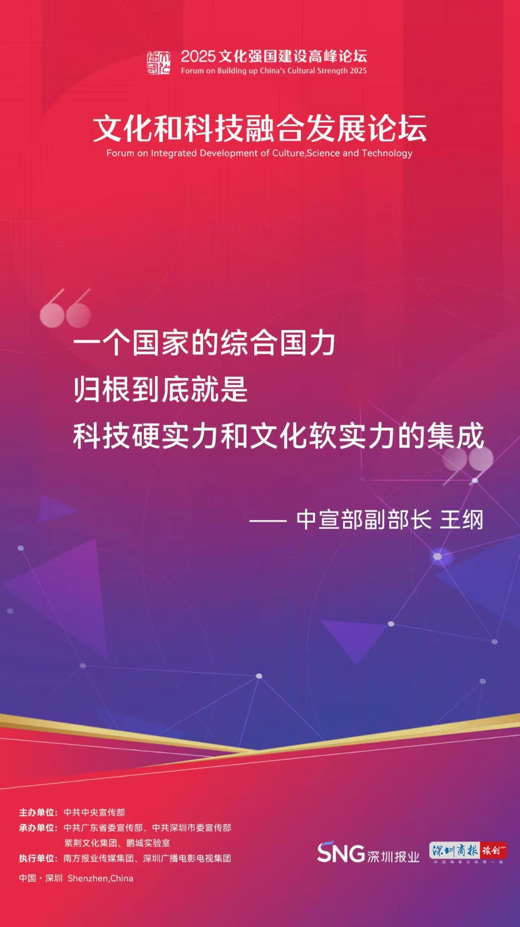 5月27日,2025年文化强国建设高峰论坛之文化和科技融合发展分论坛在深圳国际会展中心14-16号馆14会议室举行,中宣部副部长王纲出席论坛并作主旨演讲。
